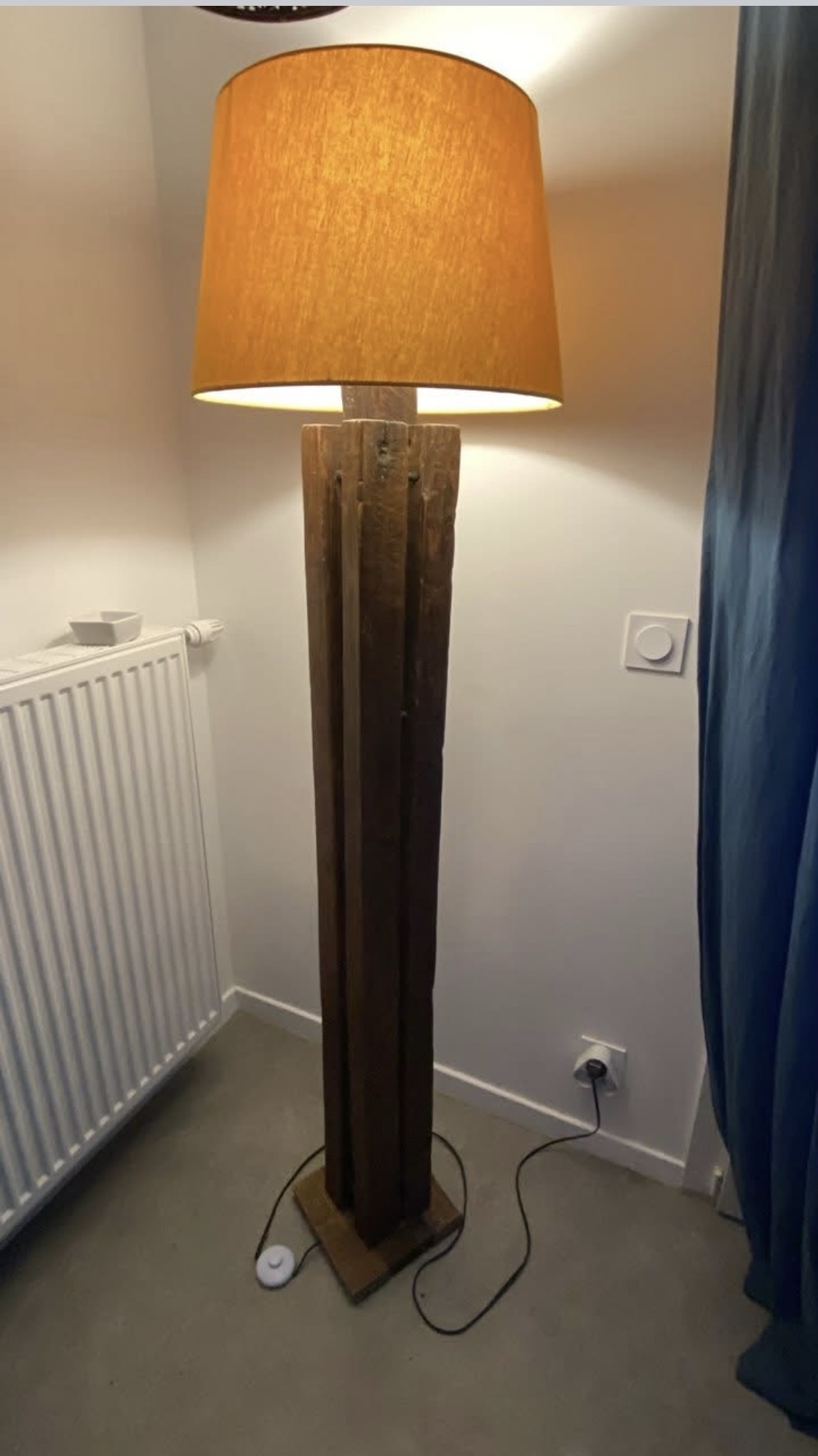 Luminaire en bois Cocktail scandinave. L'abat jour peut se changer. H : 140 cms Prix : 45 €